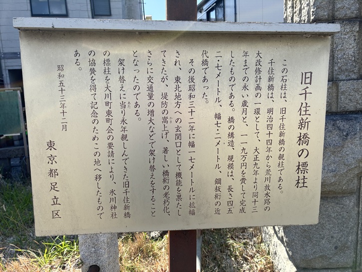 この石柱は、旧千住新橋の親柱である。千住新橋は、明治四十四年から荒川放水路の大改修計画の一環として、大正九年より同十三年までの永い歳月と、119万円を費して完成したものである。橋の構造、規模は、長さ452.7メートル、幅7.2メートル、鋼板桁の近代橋であった。その後昭和三十二年に幅17メートルに拡幅され、東北地方への玄関口として機能を果たしてきたが、堤防の嵩上げ、著しい橋桁の老朽化、さらに交通量の増大などで架け替えをすることとなったのである。架け替えに当り永年親しんできた旧千住新橋の標柱を大川町東町会の要請により、氷川神社の協賛を得て記念のためこの地へ移したものである。