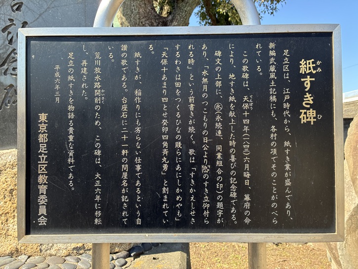 足立区は、江戸時代から、紙すき業が盛んであり、新編武蔵風土記稿にも、各村の項でそのことがのべられている。この歌碑は、天保十四年(1843年)六月晦日、幕府の命により、地すき紙を献上した時の喜びの記念碑である。碑文の上部に、丸永(永続連、同業組合の印)の題字があり、「水無月のつこもりの日公より?(岱?)のすき立仰付られる時」という前書きが続く。歌は「すきかえしせきするわさは田をつくるひなの賤らにあにしかめやも」「天保十あまり四とせ癸卯四角斉丸勇」と刻まれている。紙すきが、稲作りにも劣らない仕事であるという自賛の歌である。台座石に二十一軒の問屋名が記されている。荒川放水路開削のため、この碑は、大正六年に移転し、再建された。足立の紙すきを物語る貴重な資料である。