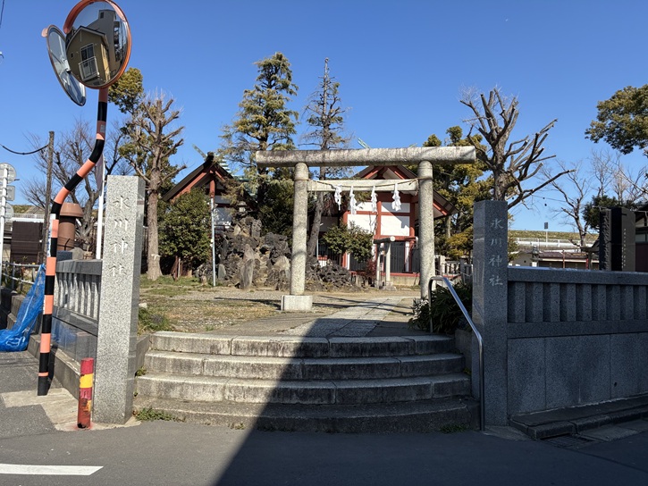 国道4号線を渡って、路地を進んだ先の荒川土手の手前に氷川神社があります。氷川神社の創建は永仁二年(1294年)で、鎮座する地名を冠して大川町氷川神社とも称されます。元々は千住五丁目の川田耕地にありましたが、荒川放水路建設工事の区域に含まれたため、大正四年(1915年)に遷座しました。