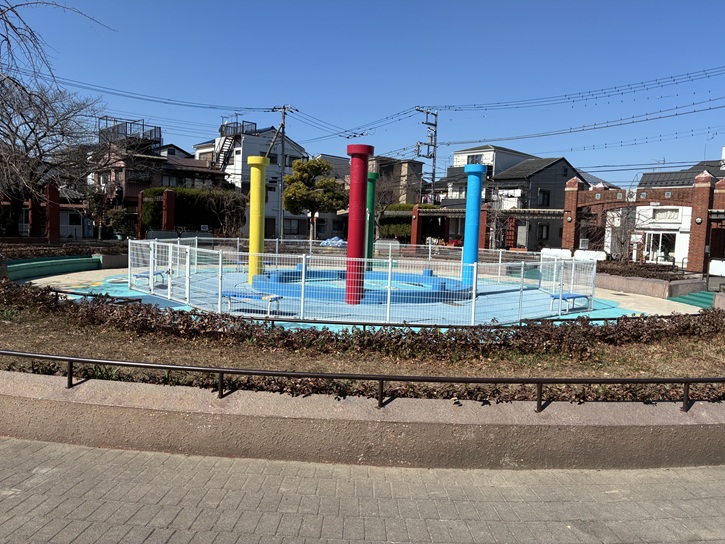 4色の円柱に守られた子どもに人気の丸いじゃぶじゃぶ池は、夏には幼児用のプールになります。暑い日に、無料で安全に水遊びができるスポットとして、多くの親子連れに利用されています。