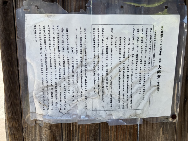 二基同じようだが彫物がそれぞれ違う。小さなお宮だけにその精巧さが何とも魅力的である。昭和四十年代に旧神輿倉の中に埃にまみれて発見された。「祭礼の神輿が町中巡行の際行列に加わった道具の一つである。内部に御神酒を容れる二本の瓶子を納め、二基を天秤棒の両端にさしこんで肩にかついで御旅所で信者に内容物を分けたのである。江戸後期の造形性がよく現れていて、特に製作年代が明記してある点が資料としても重要である。中央に金銅扁額があり、陰刻銘で表に「千住川原町」、裏に「天保五甲午歳細工人錺師宮有」とある。