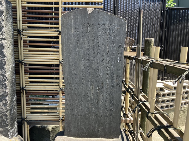 氷川神社内に合祀される高正天満宮の縁起を示す碑である。千住四丁目の名主高梨氏の系譜や、高正天満宮の由来について詳しく述べている。千住四丁目の名主高梨信平は地域の子供たちに読み書きなどを教えていた。縁故を頼って屋敷内に住むことになった正木昌房に、老齢の信平は子弟教育を託し、代々信奉していた菅原道真の像を譲った。正木氏はそれよりこの像を家神として祀り、子弟教育を家業とするようになった。昌房の孫、正木建はこの菅原道真像を個人で祀るより、氏神社内で祀ることを思い立ち、高梨氏と正木氏とに関わるこの神を、それぞれの一字をとって高正天満宮と号することにしたという。正木氏は、昌房以来、代々寺子屋「群雀堂」の経営にあたり、二代目塾主、大助(正本櫟蔭)の代には大いに発展し、来塾するものが毎日百人ほどもいたという。元治元年(1864年)に建立されたこの碑は、三代目正木建の撰文によるものであり、天満宮の由来はもとより、寺子屋開塾に至る経緯がうかがわれる貴重な資料である。平成二年(1990年)一月、足立区登録有形文化財とした。