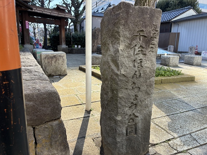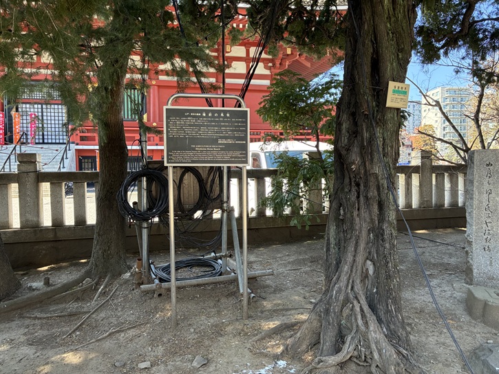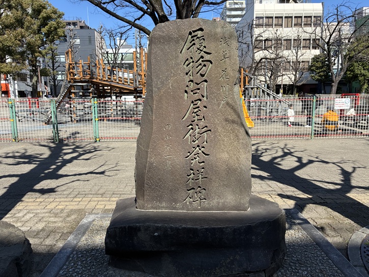 旧日光街道の碑が建っています。大伝馬町は、江戸最大の繊維問屋街として名を馳せるようになり、往時「木綿店」と通称された一角には、江戸時代には木綿問屋が74軒あり、その中でも6割以上が伊勢国(現在の三重県)の店が占め、かつ松坂出身の店が多くありました。