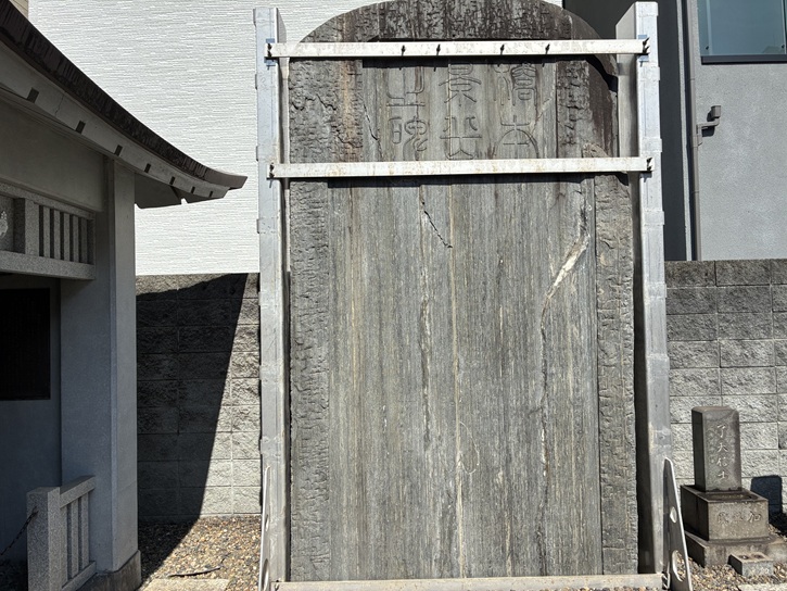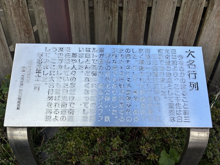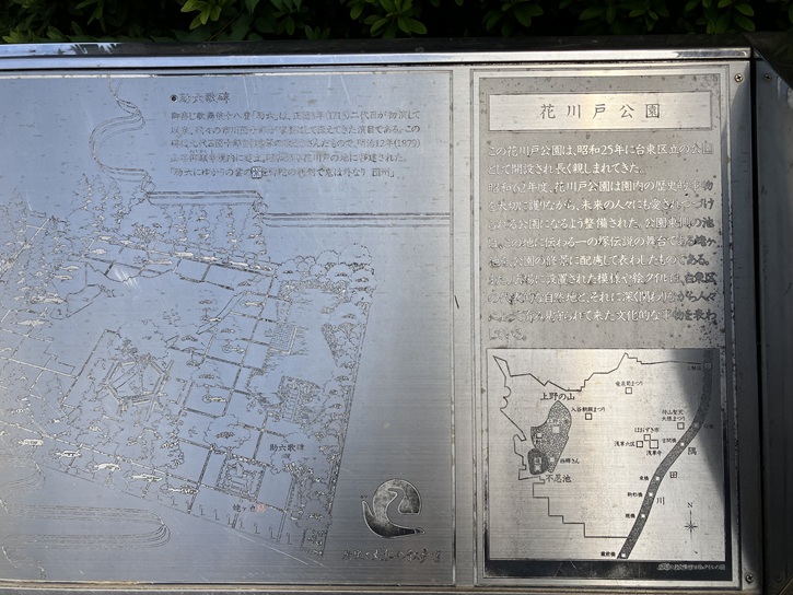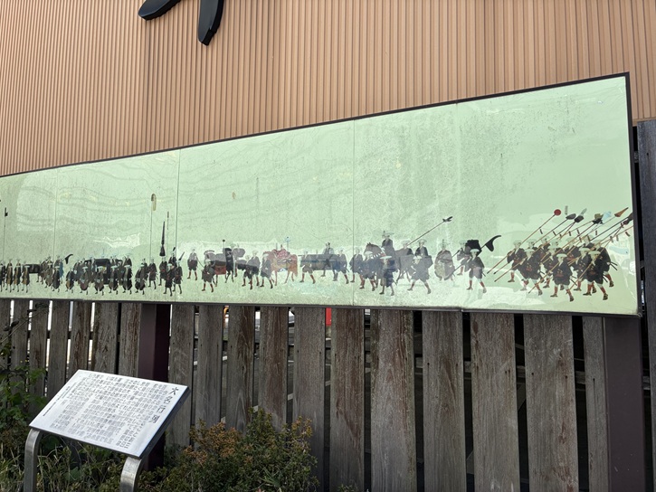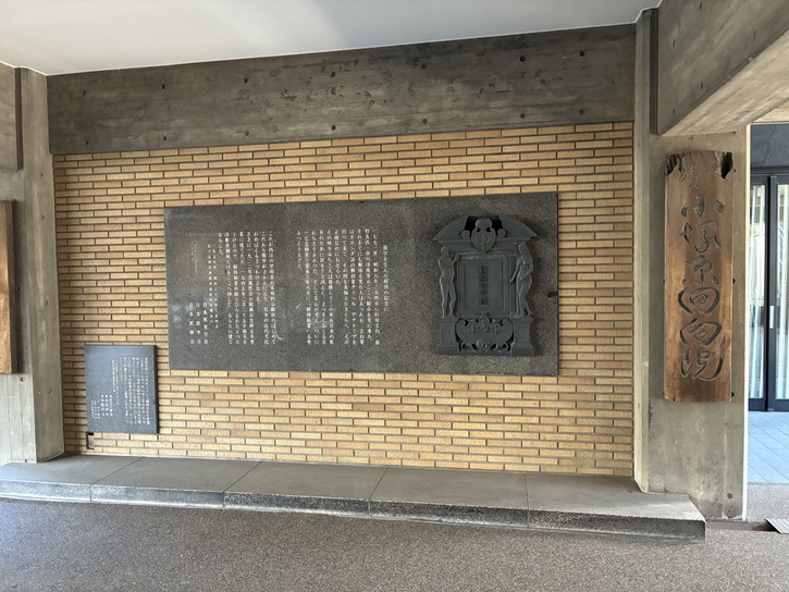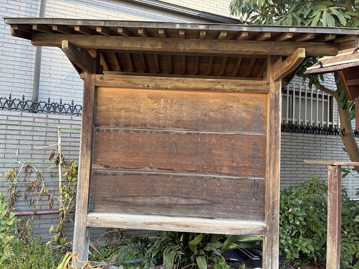 屋根付きの立派な案内板があります。銅板に彫られた江戸時代の風景画と碑文は年代物のようで、錆びてとても見づらいですね。