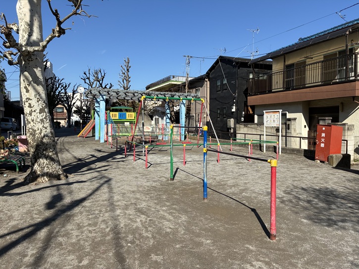 園内には、赤と青でペイントされたタコのすべり台があり、子供たちの人気者となっています。他には複合遊具やブランコもありますが、どれもカラフルな色使いで楽しい気分になります。園内には植栽や植え込みも多く、自然にも触れられる公園です。