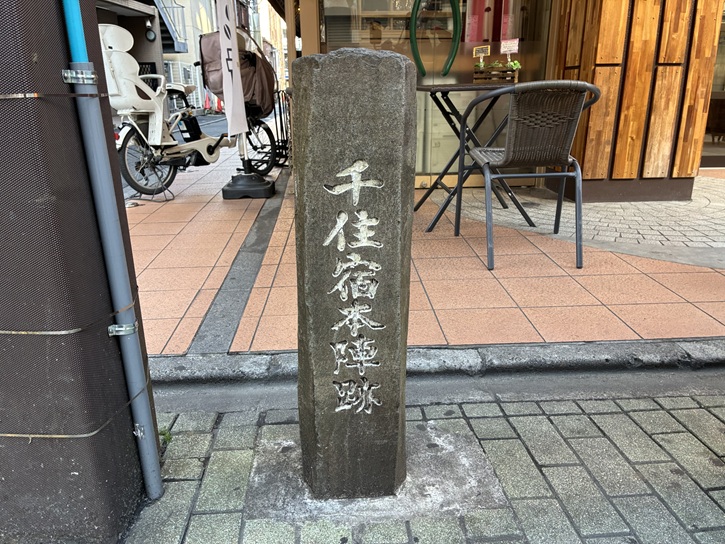 北千住駅前通りの手前の路地の入口に、千住宿本陣跡の小さな石碑が建っています。