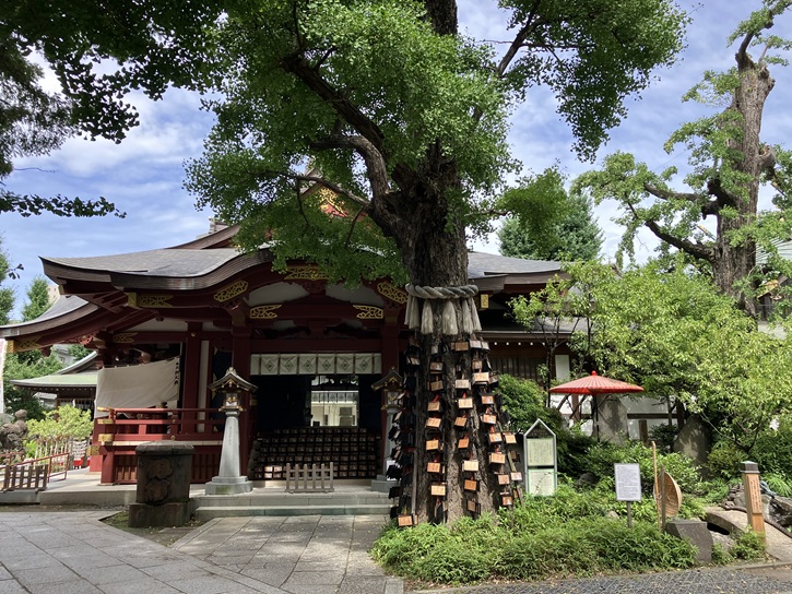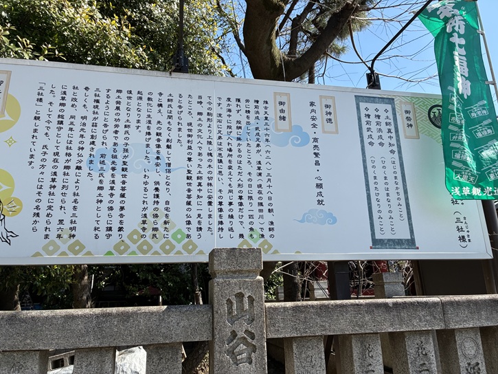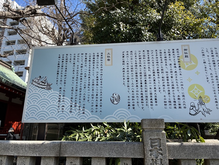 須賀神社は、推古天皇九年(600年)に創建されたといわれ、江戸時代には「牛頭天王社」・「祇園社」・「蔵前天王社」・「団子天王社」と様々な名称で呼ばれていましたが、明治元年(1868年)に「須賀神社」と改称されました。「団子天王社」の由来は、団子を奉納する祭礼があったことに因んでいます。江戸時代には、須賀神社周辺に札差が軒を連ねていて、氏子にも多くの札差がいました。そのため、須賀神社への金品の寄進が多く、祭礼は大いに賑わったといわれています。札差は、江戸時代に幕府から旗本・御家人に支給される米の仲介を業とした者をいいます。浅草の蔵前に店を出し、米の受け取り・運搬・売却による手数料を取る他、蔵米を担保に高利貸しを行って大きな利益を得ました。札差の「札」とは米の支給手形のことで、蔵米が支給される際にそれを竹串に挟んで御蔵役所の入口にある藁束に差して順番待ちをしていたことから、札差と呼ばれるようになりました。
