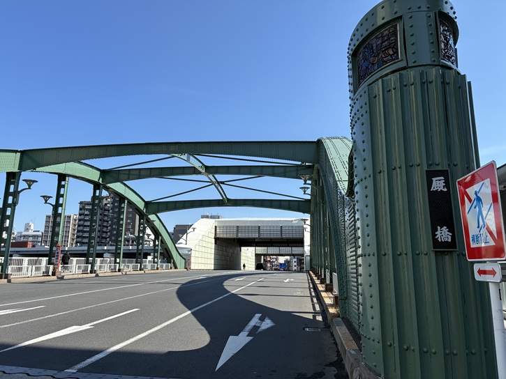 神田川に架かる浅草橋を渡ります。橋の上流・下流には多くの屋形船が係留されていますが、宴会のお客さんは戻ってきたのでしょうか?浅草橋はかなりの年期が入っていて、親柱も朽ちそうになっています。現在の浅草橋は昭和五年1月に竣工しました。ちなみに、浅草橋親柱の橋名板は関東大震災の復興当時からのものです。東京大空襲の戦禍にも耐え、架設以来90年以上も実用に供されているとは驚きです。そろそろ架け替え時では?