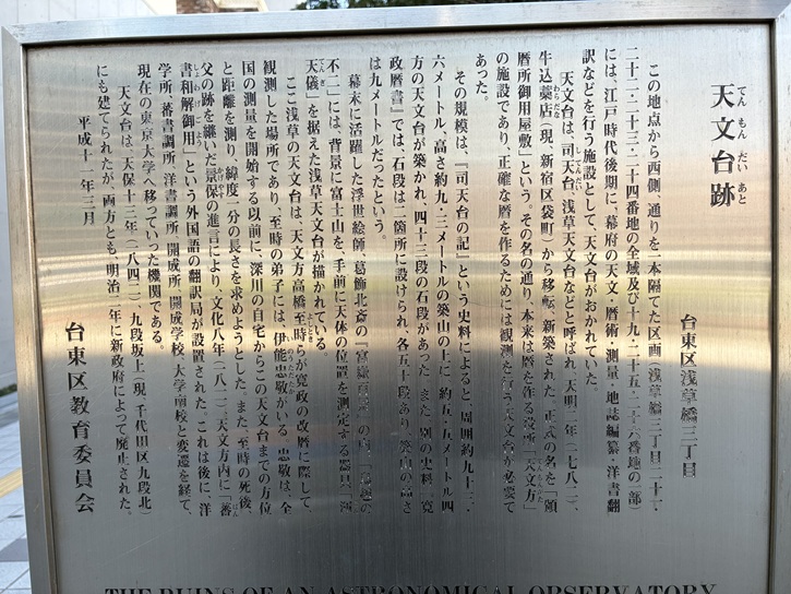 この地点から西側、通りを一本隔てた区画(浅草橋三丁目21・22・23・24番地の全域及び19・25・26番地の一部)には、江戸時代後期に、幕府の天文・暦術・測量・地誌編纂・洋書翻訳などを行う施設として、天文台がおかれていた。天文台は、司天台・浅草天文台などと呼ばれ、天明二年(1782年)、牛込藁店(現、新宿区袋町)から移転、新築された。正式の名を「頒暦所御用屋敷」という。その名の通り、本来は暦を作る役所「天文方」の施設であり、正確な暦を作るためには観測を行う天文台が必要であった。その規模は、「司天台の記」という史料によると、周囲約93.6メートル、高さ約9.3メートルの築山の上に、約5.5メートル四方の天文台が築かれ、四十三段の石段があった。また、別の史料「寛政暦書」では、石段は二箇所に設けられ、各五十段あり、築山の高さは9メートルだったという。幕末に活躍した浮世絵師・葛飾北斎の「富嶽百景」の内、「鳥越の不二」には、背景に富士山を、手前に天体の位置を測定する器具「渾天儀」を据えた浅草天文台が描かれている。ここ浅草の天文台は、天文方高橋至時らが寛政の改暦に際して、観測した場所であり、至時の弟子には、伊能忠敬がいる。忠敬は、全国の測量を開始する以前に、深川の自宅からこの天文台までの方位と距離を測り、緯度一分の長さを求めようとした。また、至時の死後、父の跡を継いだ景保の進言により、文化八年(1811年)、天文方内に「蕃書和解御用」という外国語の翻訳局が設置された。これは後に、洋学所・蕃書調所・洋書調所・開成所・開成学校・大学南校と変遷を経て、現在の東京大学へ移っていった機関である。天文台は、天保十三年(1842年)、九段坂上(現、千代田区九段北)にも建てられたが、両方とも、明治二年に新政府によって廃止された。