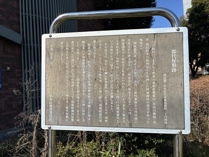 江戸時代に、主として関東の幕府直轄領の、年貢の徴収・治水・領民紛争の処理などを管理した関東郡代の役宅があった場所です。関東郡代は、天正十八年(1590年)徳川家康から代官頭に任命された伊奈忠次の二男忠治が、寛永十九年(1642年)に関東諸代官の統括などを命じられたことにより事実上始まるとされます。元禄年間(1688年〜1704年)には関東郡代という名称が正式に成立し、代々伊奈氏が世襲しました。その役宅は、初め江戸城の常盤橋門内にありましたが、明暦の大火(1657年)による焼失後、この地に移り、馬喰町郡代屋敷と称されました。寛政四年(1792年)に伊奈忠尊が罪を得て失脚した後は、勘定奉行が関東郡代を兼ねることとなり、この地に居住しました。文化三年(1806年)に関東郡代制が廃止され、さらに屋敷が焼失した後には、代官の拝領地となって、馬喰町御用屋敷と改称されましたが、江戸の人々はこの地を永く郡代屋敷と呼んでいました。