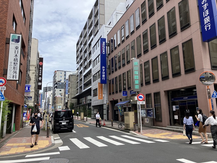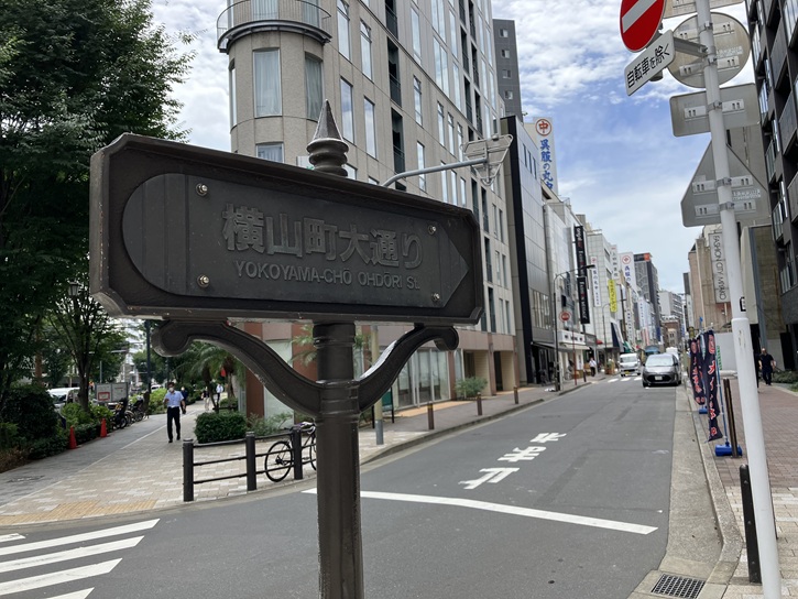 江戸通りと清杉通りと清洲橋通りに囲まれた三角形の町域が日本橋横山町です。北東から南西にかけて横山町大通りと新道通りが走り、衣料・雑貨関連の問屋が軒を連ねています。横山町大通りの一部区間は江戸時代の日光・奥州街道で、近隣に投宿する旅人向けの小間物問屋・紙煙草入問屋・地本双紙問屋等が軒を連ねていました。永禄二年(1559年)の「小田原衆所領役帳」に、石井某の知行として五貫三百文・江戸横山分とあり、これが横山町の由来と考えられています。