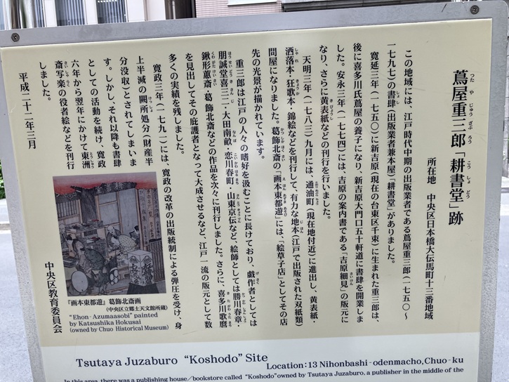 In this area, there was a publishing house/bookstore called "Koshodo" owned by Tsutaya Juzaburo, a publisher in the middle of the Edo period (1750 to 1797).