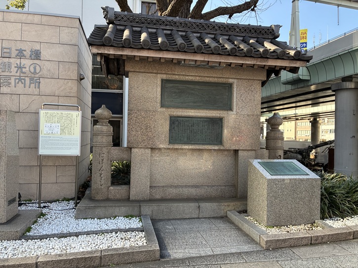 Fresh fish and other seafood for consumption in the capital were unloaded for three centuries at the market that operated along the bank of the Nihonbashi River between the Nihonbashi and Edobashi bridges. The Nihonbashi Riverside Fish Market originated in the early Edo period as a sales point for fish left over from the supplies sent to the shogun and daimyos lived in Edo castle town by the fishers of Tsukudajima. The riverbank later became the core of a very busy fish trading district sprawling across the Honfuna-cho, Odawaracho and Anjincho neighborhoods (the present Muromachi 1-chome and Honmachi 1-chome area). The center of activity was the market area along the Nihonbashi River where numerous boats docked, fully laden with fish from nearby coastal waters. Lined with fish shops that throbbed with negotiations in the high-spirited style characteristic of Edoites, with daily transactions totaling as much as a 1000 ryo (equivalent to about 16 kilograms of silver), it was one of the liveliest spots in the city of Edo. During Edo period, the seafood brought in along the Nihonbashi River was sold to dealers aboard the hiratabune (flatboats) pulled up to the wharf along the riverbank, then displayed on stands at shops on the street side of the riverbank warehouse buildings for sale to the food trade. When Tokyo was rebuilt after the Great Kanto Earthquake of 1923, the market was relocated to Tsukiji on the Sumida River, and the Tsukiji Fish Market of Tokyo Metropolitan Central Wholesale Market continues to flourish as the city's seafood wholesaling center. As a reminder of the prosperous trading era of this site, a historical monument was erected in 1954 by people who had been affiliated with the old market, with a summary of the more than 300 years of history from the founding to the relocation of the Nihonbashi Riverside Fish Market.