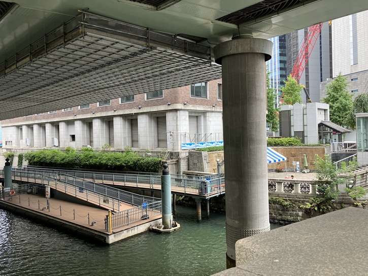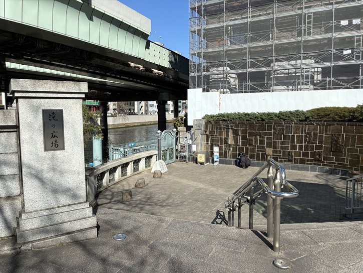 日本橋の橋詰には、南東側に「滝の広場」・南西側に「花の広場」・北東側に「乙姫広場」・北西側に「元標の広場」と命名された広場が設けられています。ここは、滝の広場で、乗船広場があります。