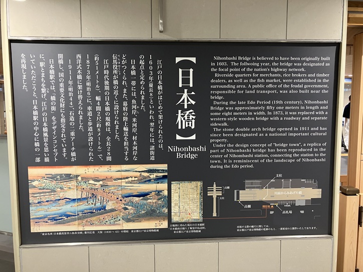 江戸の日本橋がはじめて架けられたのは、慶長八年(1603年)といわれ、翌年には、諸街道の起点と定められました。日本橋一帯には、魚河岸、米河岸、材木河岸などがつくられ、また、幕府の陸上輸送を担当する伝馬役所が橋の近くに設けられました。江戸時代後期の日本橋の規模は、全長28間(約51メートル)、幅4間2尺(約8メートル)で、明治六年(1873年)に、車道と歩道が設けられた西洋式木橋に架け替えられました。明治四十四年(1911年)、石造の二重アーチ橋が開橋し、国の重要文化財にも指定されています。日本橋駅では、「橋の街」をデザインコンセプトに、駅とまちを繋げ、江戸の日本橋風景を思い描いていただこうと、日本橋駅の中心に橋の一部を再現しました。