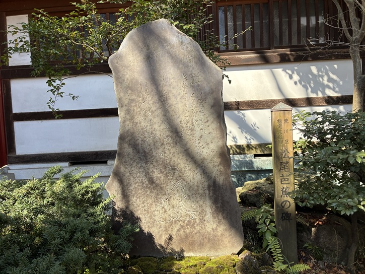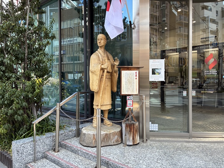 足立成和信用金庫の店頭に芭蕉像が立っています。