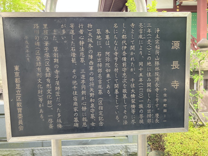 @ 嘉暦二年(1327年)、勝専寺の中興開基(支援者)である武士・新井図書政次(あらいずしょまさつぐ)が、荒川(現在は隅田川)で千手観音像を見つけたことにちなみ、「せんじゅ」と呼んだという説。