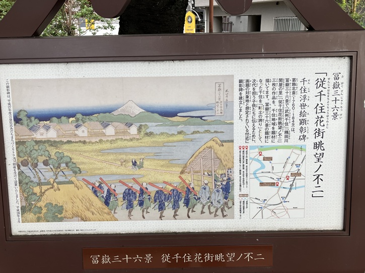 この案内板がある小道は千住二丁目と千住三丁目の境界をなす通りで、北千住駅前通りが全通する昭和初期迄はかなり重要な通りでした。