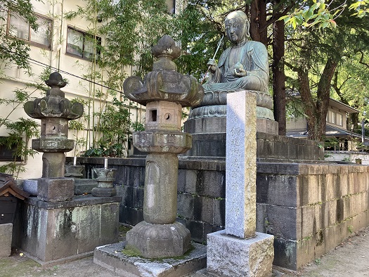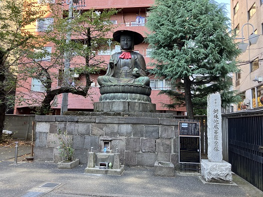今日は長距離を歩くことになるので、路地は通らずに幹線道路を主体にルートを選びました。巣鴨駅から白山通りを南下し、千石一丁目交差点を左折して不忍通りを進みます。団子坂下交差点を左折して三崎坂を上り、上野桜木交差点を左折して言問通りを進みます。谷中霊園の入口の上野桜木二丁目交差点で浄名院に立寄ります。境内には青銅製の地蔵菩薩座像が鎮座していますが、これは深川永代寺の第六番地蔵菩薩の代仏として明治三十九年に建立されたそうです。但し、他の地蔵菩薩坐像とはお姿が異なります。地蔵菩薩座像の前にある案内板には、第六番として永代寺でなく、(議論はあるようですが)浄名院と記されています。言問通りに戻り、根岸一丁目交差点を左折して金杉通りを進みます。根岸柳通り交差点を右折し、昭和通りと国際通りを横断し、吉原大門交差点から路地奥の東禅寺に到着します。入口のド正面に地蔵菩薩座像が鎮座されています。吉野通り・江戸通りを進み、駒形橋を渡って清澄通りを南下します。春日通り・蔵前橋通り・京葉道路・竪川・新大橋通り・小名木川・清洲橋通りと交差し、深川資料館通りに面した霊厳寺に立寄ります。再び清澄通りに戻り、首都高深川線の先から深川公園に入ります。永代寺に立寄りますが、江戸六地蔵については何も痕跡がありません。深川公園の植え込みの中に「富岡八幡宮別当永代寺跡」の石柱が建っています。石柱の文字は読み取れませんが、ネットの情報では、