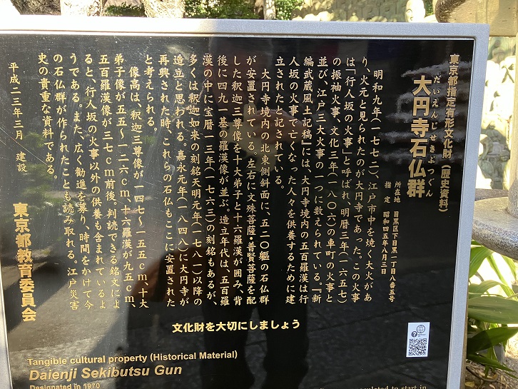 明和九年(1772年)、江戸市中を焼く大火があり、火元と見られたのが大円寺であった。この火事は「行人坂の火事」と呼ばれ、明暦三年(1657年)の振袖火事、文化三年(1806年)の車町の火事と並び、江戸三大火事の一つに数えられている。「新編武蔵風土記稿」には、大円寺境内の五百羅漢は行人坂の火事で亡くなった人々を供養するために建 立されたと記されている。大円寺境内の北東側斜面に、520躯(身に區)の石仏群が安置されている。左右に文殊菩薩・普賢菩薩を配した釈迦三尊像を十大弟子と十六羅漢が囲み、背後に491基の羅漢像が並ぶ。造立年代は、五百羅漢の中に宝暦十三年(1763年)の刻銘もあるが、多くは釈迦如来の刻銘天明元年(1781年)以降の造立と思われる。嘉永元年(1848年)に大円寺が再興された時、これらの石仏もここに安置されたと考えられる。像高は、釈迦三尊像が147cm〜155cm、十大弟子像が55cm〜126cm、十六羅漢が95cm、五百羅漢像が37cm前後。判読できる銘文によると、行人坂の火事以外の供養も含まれているようである。また、広く勧進を募り、時間をかけて今の石仏群が作られたことも読み取れる。江戸災害史の貴重な資料である。