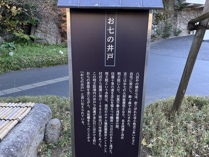 八百やの娘お七は、恋こがれた寺小姓吉三あいたさに自宅に放火し、鈴ヶ森で火刑にされた。吉三はお七の火刑後僧侶となり、名を西運と改め明王院に入り、目黒不動と浅草観音の間、往復十里の道を念仏を唱えつつ隔夜一万日の行をなし遂げた。明王院という寺院は、現在のホテル雅叙園東京エントランス付近から庭園に架(か?)け明治十三年(1880年)頃まであった。この明王院境内の井戸で西運が念仏行に出かける前にお七の菩提を念じながら、水垢離をとったことから「お七の井戸」と言い伝えられている。