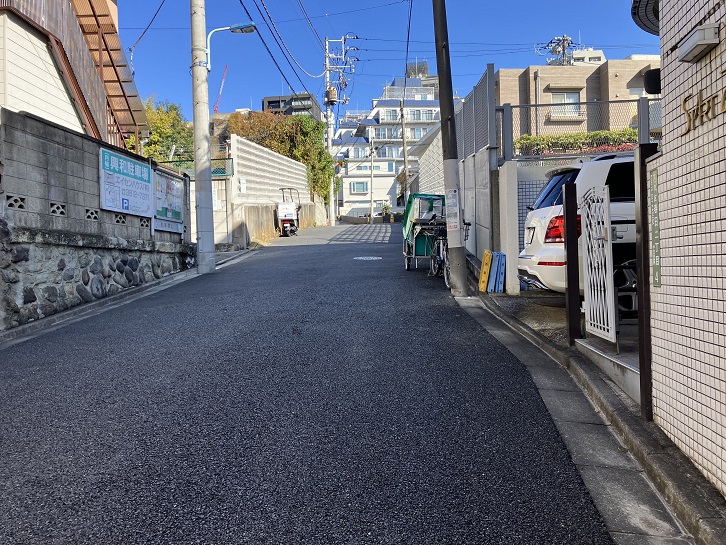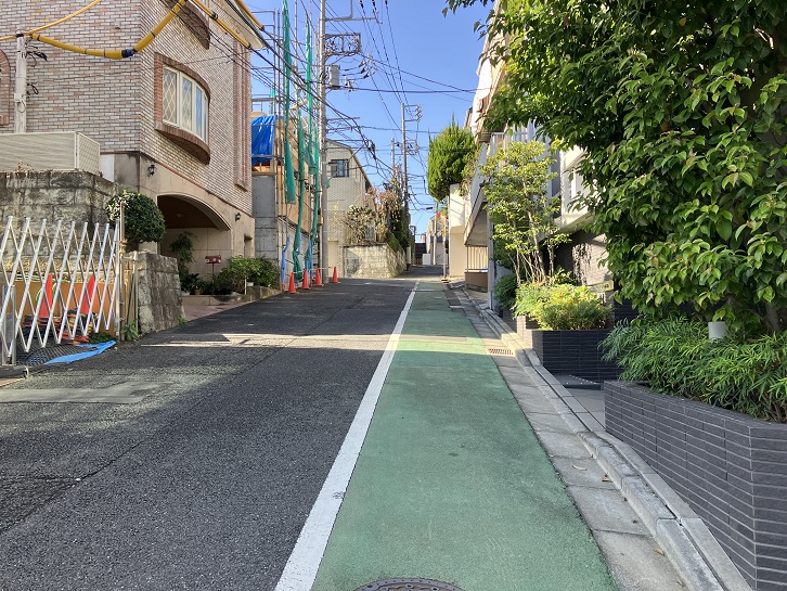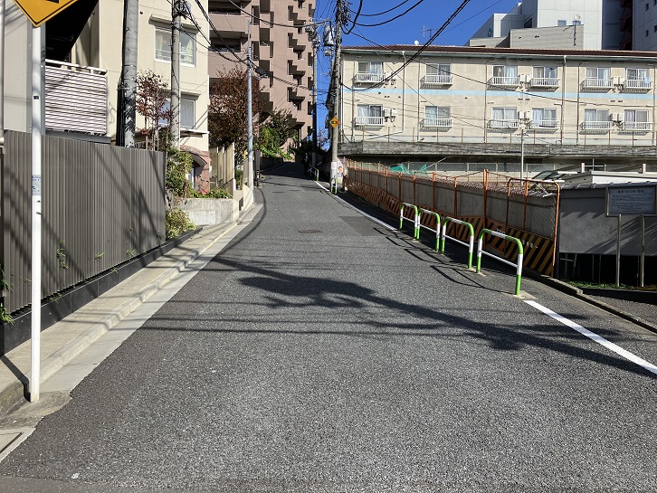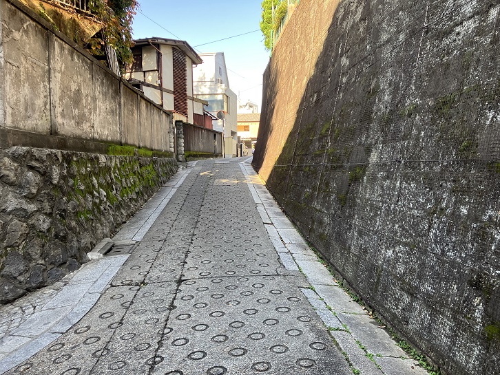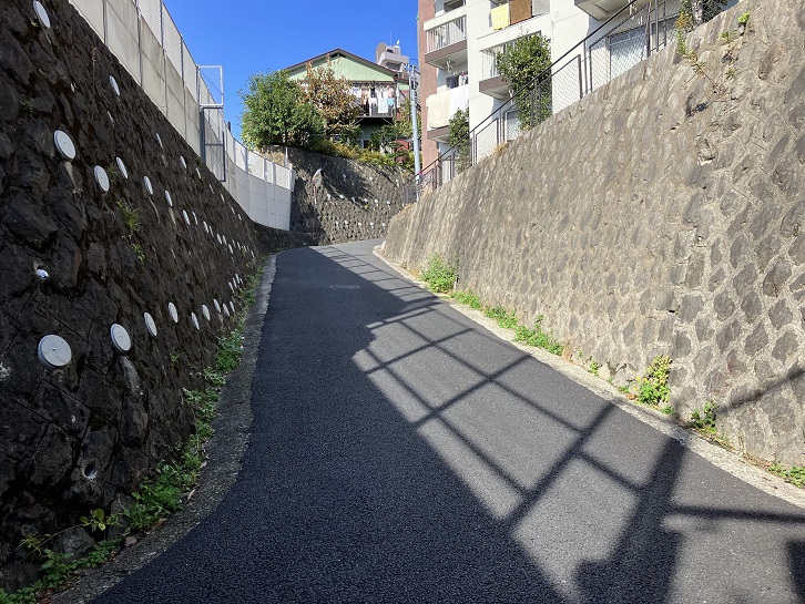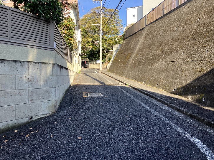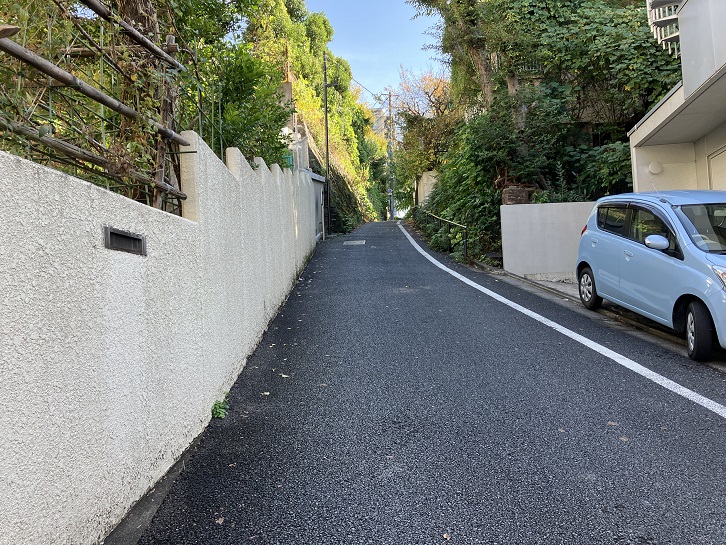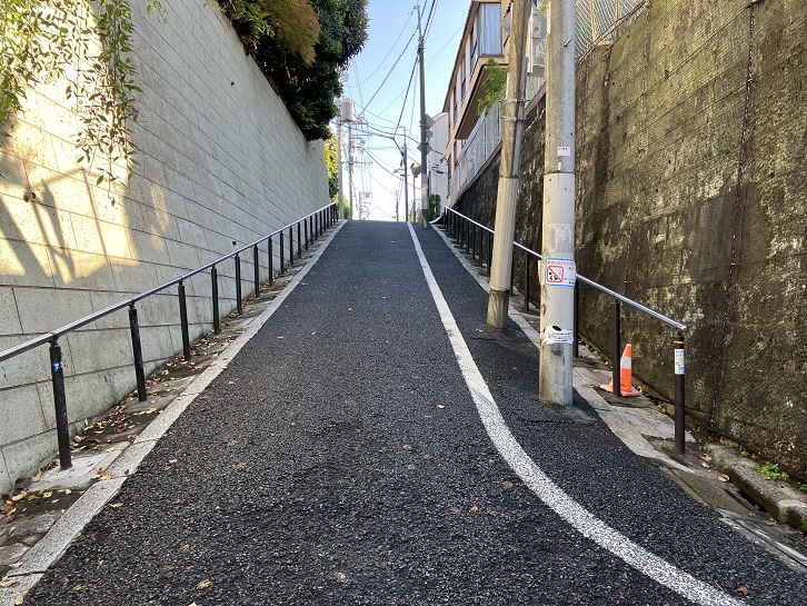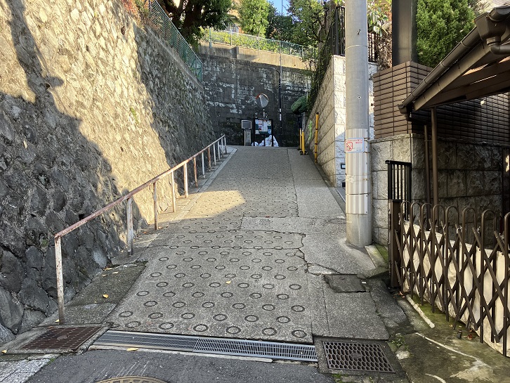 切支丹屋敷跡から住宅地の路地を抜けた先に曲がりくねった急坂が下りています。