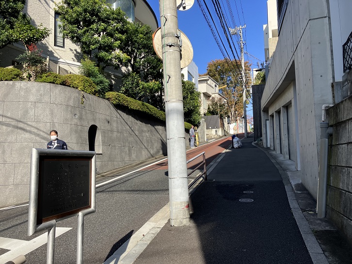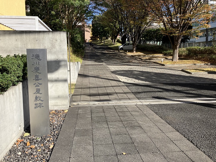 金富小学校と国際仏教学大学院大学の間に緩やかな坂が上っています。国際仏教学大学院大学の広大な敷地は徳川慶喜公の屋敷跡で、徳川慶喜終焉の地でもあります。