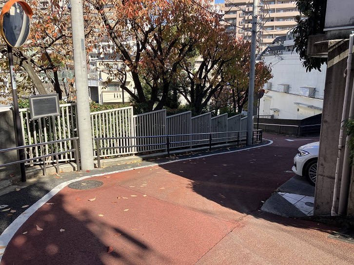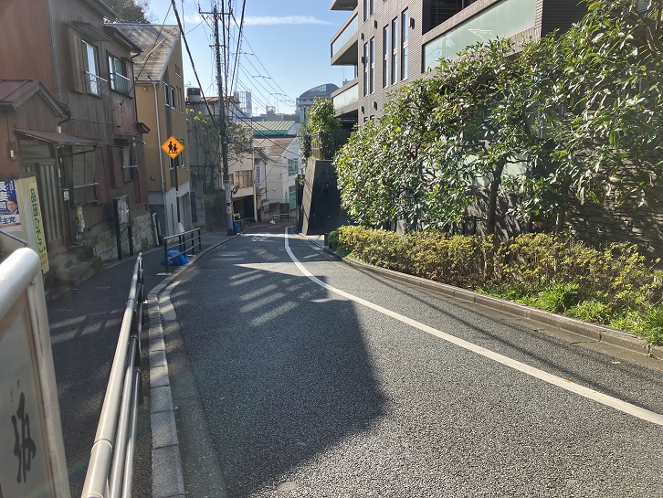薬罐坂から南方向に進みますと、称名寺の東脇に沿ってクランク状に折れ曲がった下り坂があります。
