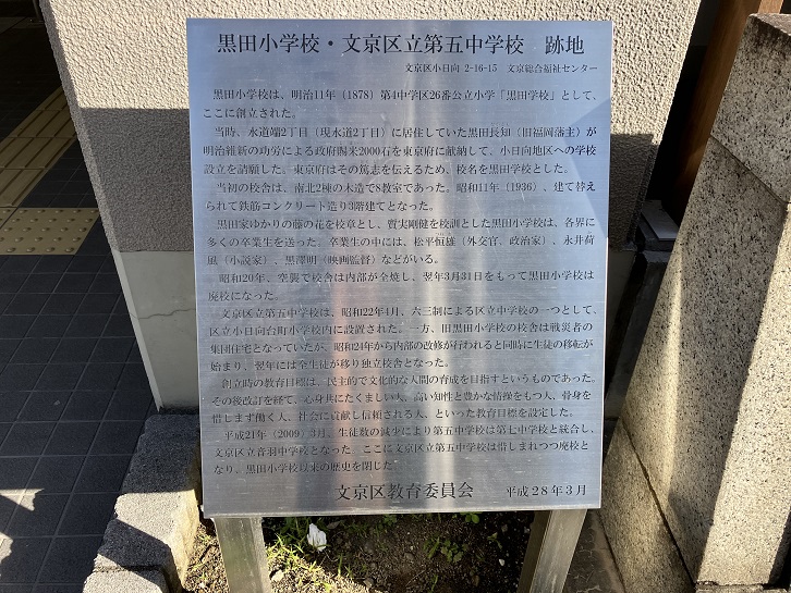 大日坂下交差点から東に向かって進みます。とあるビルの前に、「黒田小学校・文京区立第五中学校跡地」の案内板が立っています。