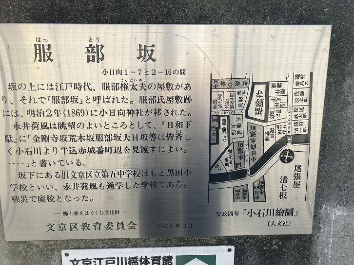 服部坂は、文京江戸川橋体育館の横を北方向に上る長さ100mほどの坂です。体育館の入口横の壁に案内板が貼られています。さきほど見た黒田小学校と文京区立第五中学校についても触れられています。