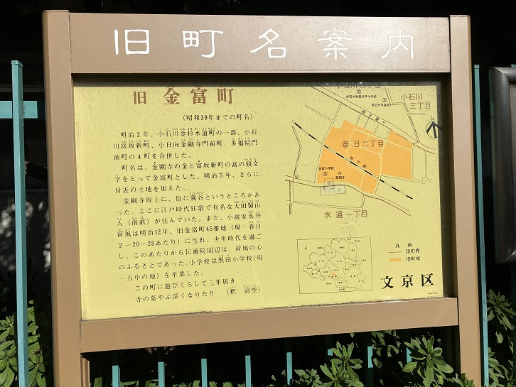 明治二年、小石川金杉水道町の一部、小石川富坂新町、小日向金剛寺門前町、多福院門前町の4町を合併した。町名は、金剛寺の金と富坂新町の富の頭文字をとって金富町とした。明治五年、さらに付近の土地を加えた。金剛寺坂上に、俗に鶯谷というところがあった。ここに江戸時代狂歌で有名な大田蜀山人(南畝)が住んでいた。また、小説家永井荷風は明治十二年、旧金富町45番地(現・春日2−20−25あたり)に生れ、少年時代を過ごし、このあたりから伝通院周辺は、荷風の心のふるさとであった。小学校は黒田小学校(現・五中の地)を卒業した。