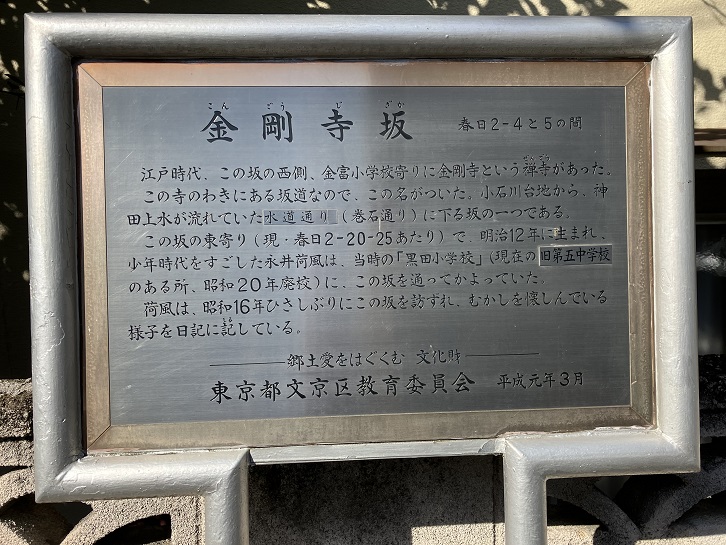 江戸時代、この坂の西側、金富小学校寄りに金剛寺という禅寺があった。この寺のわきにある坂道なので、この名がついた。小石川台地から、神田上水が流れていた水道通り(巻石通り)に下る坂の一つである。この坂の東寄り(現・春日2−20−25あたり)で、明治十二年に生まれ、少年時代をすごした永井荷風は、当時の「黒田小学校」(現在の旧第五中学校のある所、昭和二十年廃校)に、この坂を通ってかよっていた。荷風は、昭和十六年ひさしぶりにこの坂を訪ずれ、むかしを懐しんでいる様子を日記に記している。