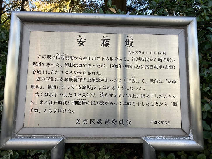 この坂は伝通院前から神田川に下る坂である。江戸時代から幅の広い坂道であった。傾斜は急であったが、明治四十二年(1909年)に路面電車(市電)を通すにあたりゆるやかにされた。坂の西側に安藤飛騨守の上屋敷があったことに因んで、戦前は「安藤殿坂」、戦後になって「安藤坂」とよばれるようになった。古くは坂下のあたりは入江で、漁をする人が坂上に網を干したことから、また江戸時代に御鷹掛の組屋敷があって鳥網を干したことから「網干坂」ともよばれた。