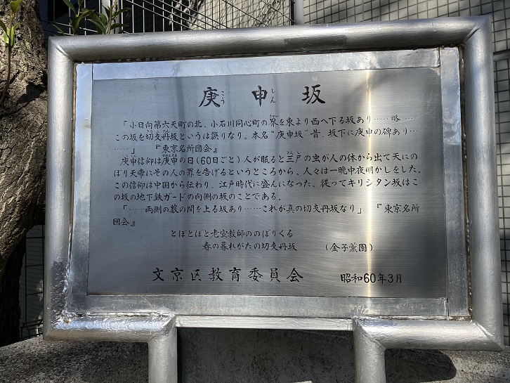 「小日向第六天町の北、小石川同心町の界を東より西へ下る坂あり・・・・略・・・・この坂を切支丹坂というは誤りなり。本名”庚申坂”。昔、坂下に庚申の碑あり・・・・」「東京名所図会」。庚申信仰は庚申の日(60日ごと)人が眠ると三尸の虫が人の体から出て天にのぼり、天帝にその人の罪を告げるというところから、人々は一晩中夜明かしをした。この信仰は中国から伝わり、江戸時代に盛んになった。従って、切支丹坂はこの坂の地下鉄ガードの向側の坂のことである。「・・・・両側の藪の間を上る坂あり・・・・これが真の切支丹坂なり」「東京名所図会」。