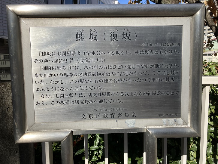「蛙坂は七間屋敷より清水谷へ下る坂なり、或は復坂ともかけり、そのゆへ詳にせず」(改撰江戸誌)。「御府内備考」には、坂の東の方はひどい湿地帯で蛙が池に集まり、また向かいの馬場六之助様御抱屋敷内に古池があって、ここにも蛙がいた。むかし、この坂で左右の蛙の合戦があったので里俗に蛙坂とよぶようになったと伝えている。なお、七間屋敷とは、切支丹屋敷を守る武士たちの組屋敷のことであり、この坂道は切支丹坂へ通じている。