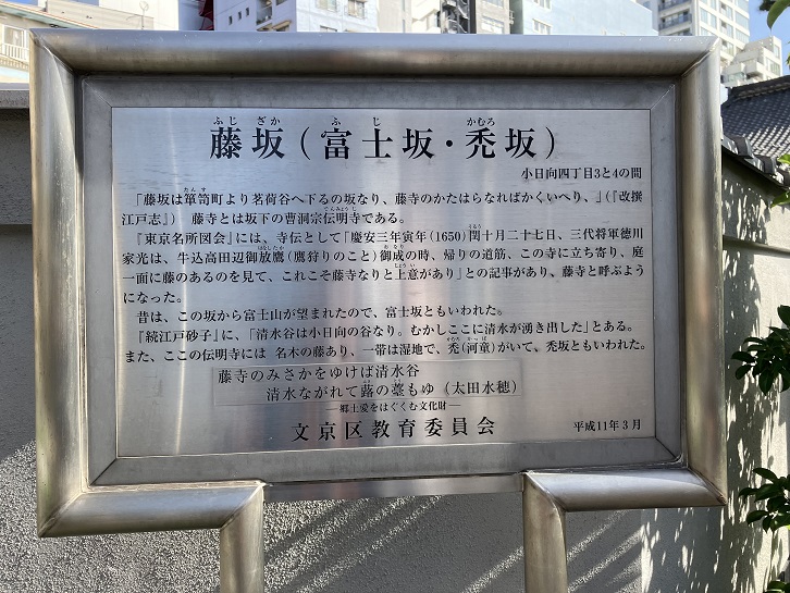 藤坂は春日通りを挟んで播磨坂の延長上に長さ75mほどの短い坂で、別名が富士坂とか禿坂となっています。藤寺(傳明寺)の前の坂であることが坂名の由来になっています。