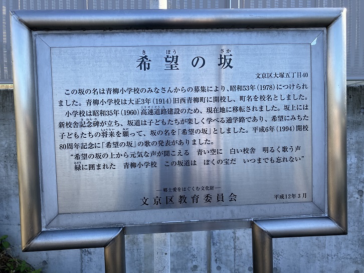 希望の坂は、不忍通りの護国寺西交差点と日大豊山中・高校の中間辺り、区立アカデミー音羽の西側から青柳小学校校門に突き当たる長さ約140mほどのやや急で真っ直ぐの坂道です。坂名は公募により決められました。希望に満ちた子どもたちの将来を願ってこの名前になったそうです。小学校内の通学路に行政の案内板が立っているのは珍しいですね。20年ほど前の写真を見ますと、土台の壁面にカラフルな文字で「希望の坂」と書かれていたようですが、現在は無字になっています。