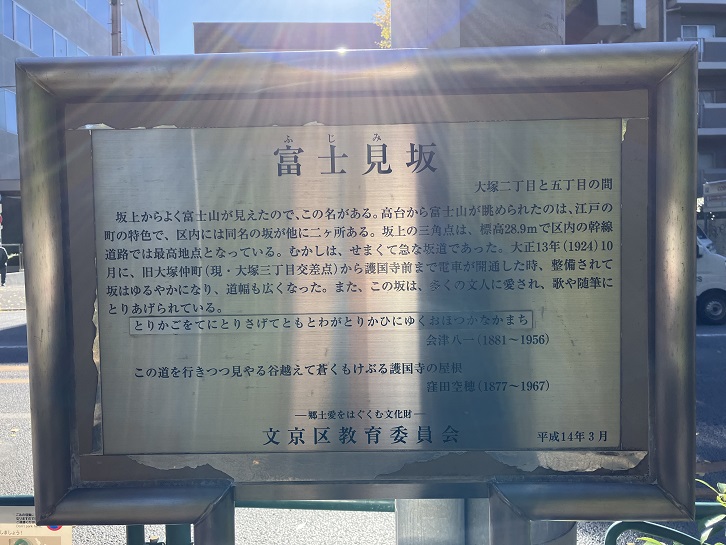 富士見坂は、不忍通りの護国寺前交差点付近から春日通りと交差する大塚三丁目交差点付近まで続く長さ約400mほどの緩やかな坂です。周囲に高い建物がなかった江戸時代には、坂上から富士山がよく見えたのが坂名の由来とのことです。現在でも条件がよければビルの間に富士山の山頂付近の姿を見ることができるそうです。
