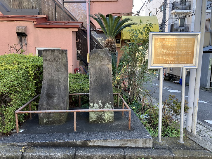 猫又坂の案内板のとなりにふたつの石柱のモニュメントが置かれ、石柱がかっての猫又橋の親柱の袖石であったことが石柱の横に立つ案内板に記されています。