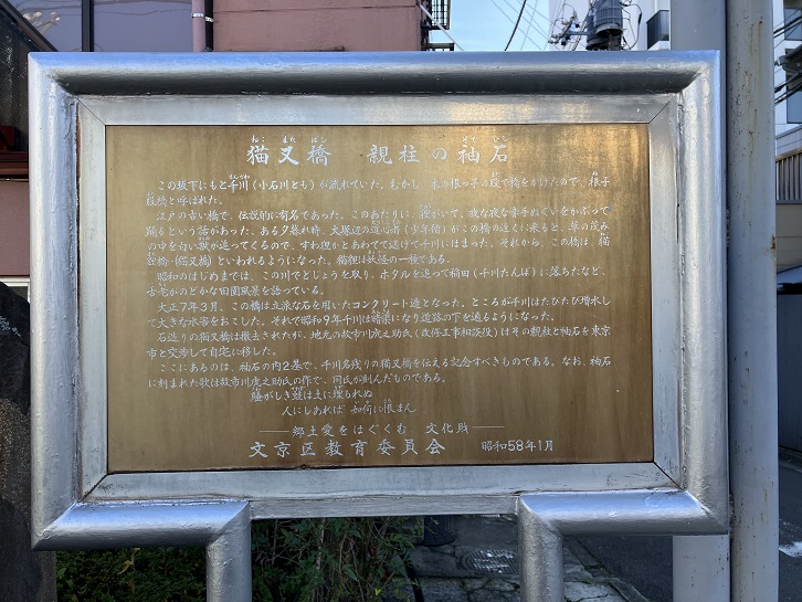 この坂下にもと千川(小石川とも)が流れていた。むかし、木の根っ子の股で橋をかけたので、根子股橋と呼ばれた。江戸の古い橋で、伝説的に有名であった。このあたりに、狸がいて、夜な夜な赤手ぬぐいをかぶって踊るという話があった。ある夕暮れ時、大塚辺の道心者(少年僧)がこの橋の近くに来ると、草の茂みの中を白い獣が追ってくるので、すわ狸かとあわてて逃げて千川にはまった。それから、この橋は、猫狸橋・(猫又橋)といわれるようになった。猫狸は妖怪の一種である。昭和のはじめまでは、この川でどじょうを取り、ホタルを追って稲田(千川たんぼ)に落ちたなど、古老がのどかな田園風景を語っている。大正七年3月、この橋は立派な石を用いたコンクリート造となった。ところが千川はたびたび増水して大きな水害をおこした。それで昭和九年千川は暗渠になり道路の下を通るようになった。石造りの猫又橋は撤去されたが、地元の故市川虎之助氏(改修工事相談役)はその親柱と袖石を東京市と交渉して自宅に移した。ここにあるのは、袖石の内2基で、千川名残りの猫又橋を伝える記念すべきものである。なお、袖石に刻まれた歌は故市川虎之助氏の作で、同氏が刻んだものである。