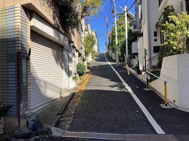 六角坂の坂上から南に向かい、途中で左に折れると急坂が下っています。
