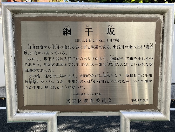 白山台地から千川の流れる谷に下る坂道である。小石川台地へ上る「湯立坂」に向かいあっている。むかし、坂下の谷は入江で舟の出入りがあり、漁師がいて網を干したのであろう。明治の末頃までは千川沿いの一帯は「氷川たんぼ」といわれた水田地帯であった。その後、住宅や工場がふえ、大雨のたびに洪水となり、昭和九年に千川は暗渠になった。なお、千川は古くは「小石川」といわれたが、いつの頃からか千川と呼ばれるようになった。