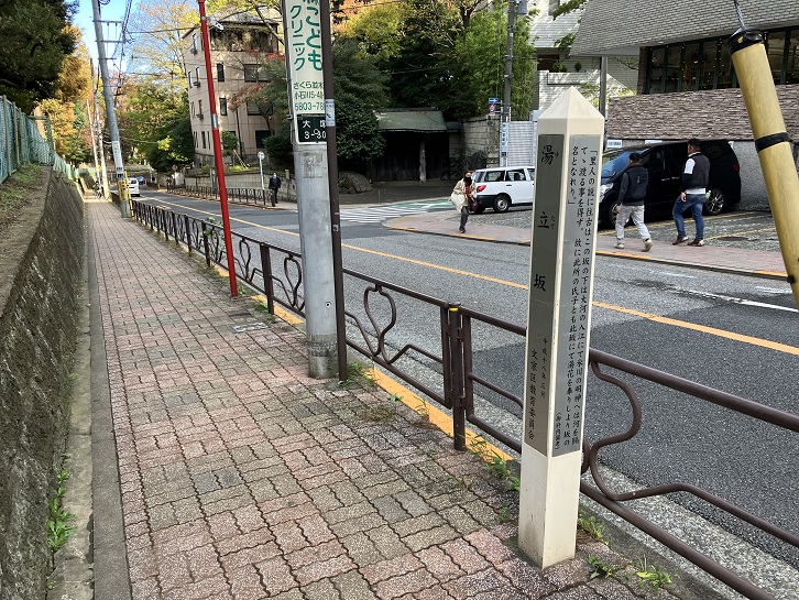 湯立坂は教育の森公園の南東側に沿って上る坂道で、坂下は網干坂に繋がっています。長さ約330mほどの少し左右に曲がる緩やかな傾斜をしています。坂名には暗闇坂とか湯坂という別名があり、昔この坂の下には川が流れていて氷川神社に渡ることができなかったので、神社の氏子は川の手前で湯花を捧げ、この名が付いたとのことです。湯花とは湯の沸騰時に上がる泡のことで、神社で巫女などがこれを笹の葉につけ、参詣人にかけ浄めました。この儀式を「湯立」といいます。坂上の教育の森公園入口脇に文京区が設置した案内柱がありますが、坂道の案内板が多い中で案内柱は珍しいですね。