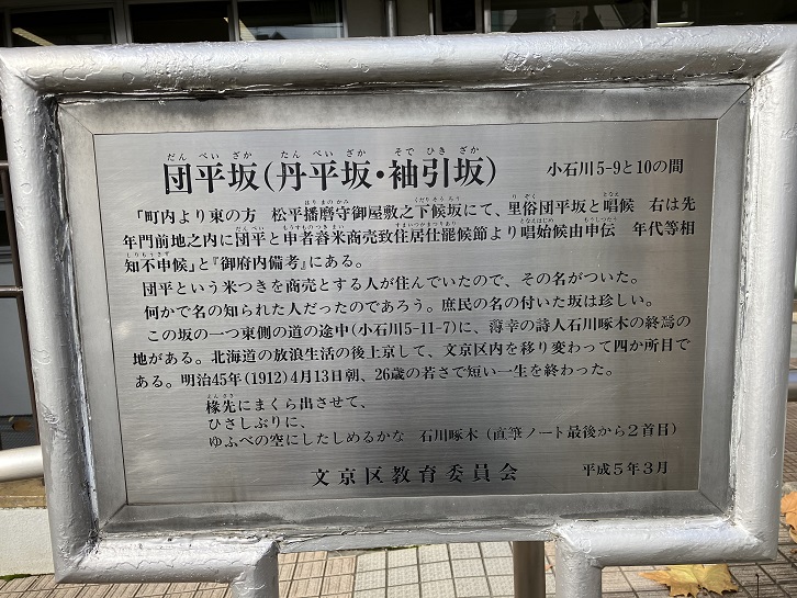 「町内より東の方、松平播磨守御屋敷之下候坂にて、里俗団平坂と唱候。右は先年門前地之内に団平と申者春米商売致住居仕罷候節より唱始候由申伝、年代等相知不申候」と「御府内備考」にある。団平という米つきを商売とする人が住んでいたので、その名がついた。何かで名の知られた人だったのであろう。庶民の名の付いた坂は珍しい。この坂の一つ東側の道の途中(小石川5−11−7)に、薄幸の詩人石川啄木の終焉の地がある。北海道の放浪生活の後上京して、文京区内を移り変わって四か所目である。明治四十五年(1912年)4月13日朝、26歳の若さで短い一生を終わった。