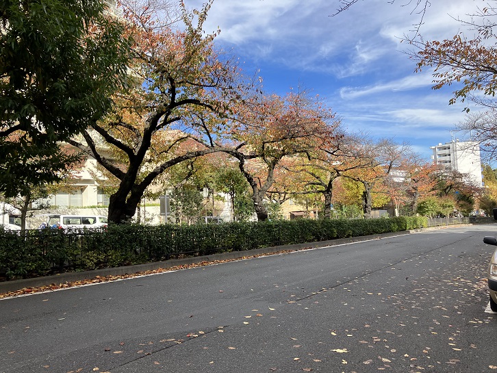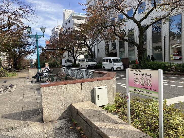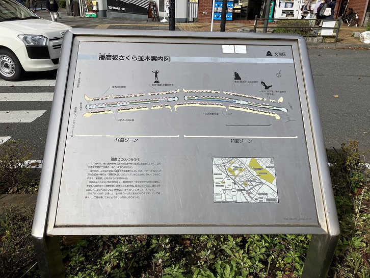 播磨坂は春日通りから東北東に分岐し、道路の中央が幅広い公園(グリーンベルト)になっています。道路の両側と公園の中には桜の並木が続いていて、文京区有数の花見の名所になっています。桜の季節でなくてもベンチに座って木々を眺めながら休息できます。