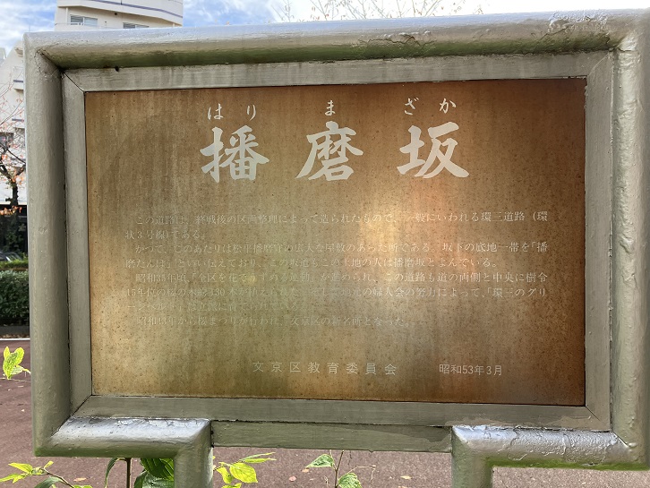 かつて、このあたりは常陸府中藩主松平播磨守の上屋敷で、坂下には千川(小石川)が流れ、「播磨田圃」といわれた田圃があった。戦後できたこの坂は、播磨屋敷の跡地を通り、「播磨田圃」へ下る坂ということで、「播磨坂」とよぶようになった。坂の桜並木は、戦後間もない昭和二十二年、地元の人たちが植えたのがはじまりである。昭和二十八年には小針平三氏他、有志からの苗木寄贈により桜並木が生まれた。その後、並木植樹帯の整備がすすみ、平成七年には装いを新たにした桜並木が完成した。昭和四十三年には「桜まつり」が地元町会・婦人会の協力で開始され、今日まで桜の名所として区民に親しまれている。