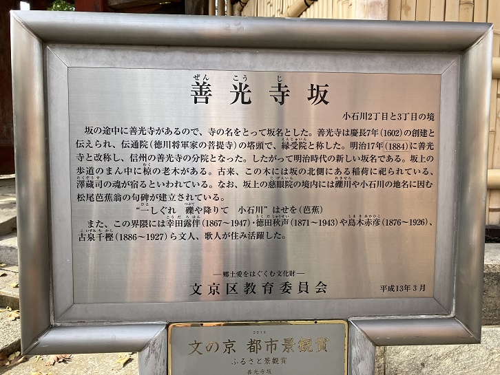善光寺坂は、伝通院前から東の白山通りに向かって淑徳学園の前から善光寺の門前まで続く長さ約200mほどの緩やかな坂道です。坂道に面して、慈眼院(沢蔵司稲荷)と善光寺が隣り合って並んでいます。坂名は善光寺の前を通っていることに由来しています。善光寺は信州の善光寺の分院なので、別名を信濃坂といいます。