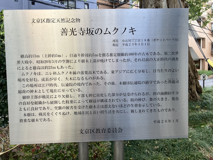樹高約13m(主幹約5m)、目通り幹周約5mを測る推定樹齢約400年の古木である。第二次世界大戦中、昭和二十年5月の空襲により樹木上部が焼けてしまったが、それ以前の大正時代の調査によると樹高は約23mもあった。ムクノキは、ニレ科ムクノキ属の落葉高木である。東アジアに広く分布し、日当たりのよい場所を好む。成長が早く、大木になるものがある。この場所は江戸時代、伝通院の境内であった。その後、本樹は伝通院の鎮守であった澤蔵司稲荷の神木として現在に至っている。樹幹上部が戦災により欠損し、下部も幹に炭化した部分が見受けられるが、幹の南側約半分の良好な組織から展開した枝葉によって樹冠が構成されている。枝の伸び、葉の大きさ、葉色ともに良好であり、空襲の被害を受けた樹木とは思えないほどの生育を示している。本樹は、戦災をくぐりぬけ、地域住民と長い間生活を共にし、親しまれてきたものであり、貴重な樹木である。