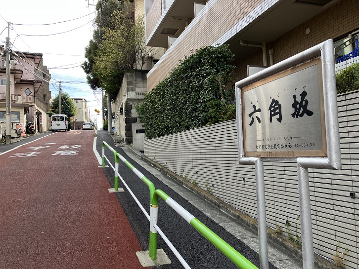 善光寺坂の坂下からすぐ先を右に折れると途中で直角に曲がった急坂が上がっています。六角坂は長さ90mほどの坂道で、高家の六角氏の邸前を通っていたことが坂名の由来です。