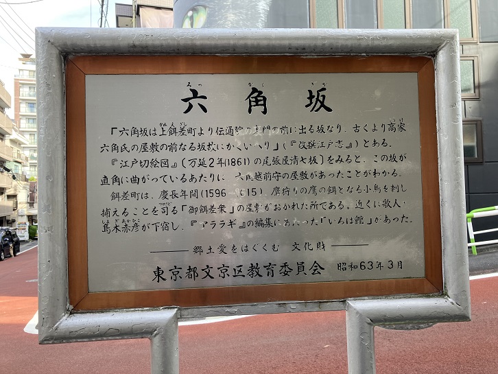 「六角坂は上餌差町より伝通院の裏門の前に出る坂なり、古くより高家六角氏の屋敷の前なる坂故にかくいへり」(「改撰江戸志」)とある。「江戸切絵図」(万延二年【1861年】の尾張屋清七板)をみると、この坂が直角に曲がっているあたりに六角越前守の屋敷があったことがわかる。餌差町は、慶長年間(1596年〜1615年)、鷹狩りの鷹の餌となる小鳥を刺し捕えることを司る「御餌差衆」の屋敷がおかれた所である。近くに歌人・島木赤彦が下宿し、「アララギ」の編集にあたった「いろは館」があった。
